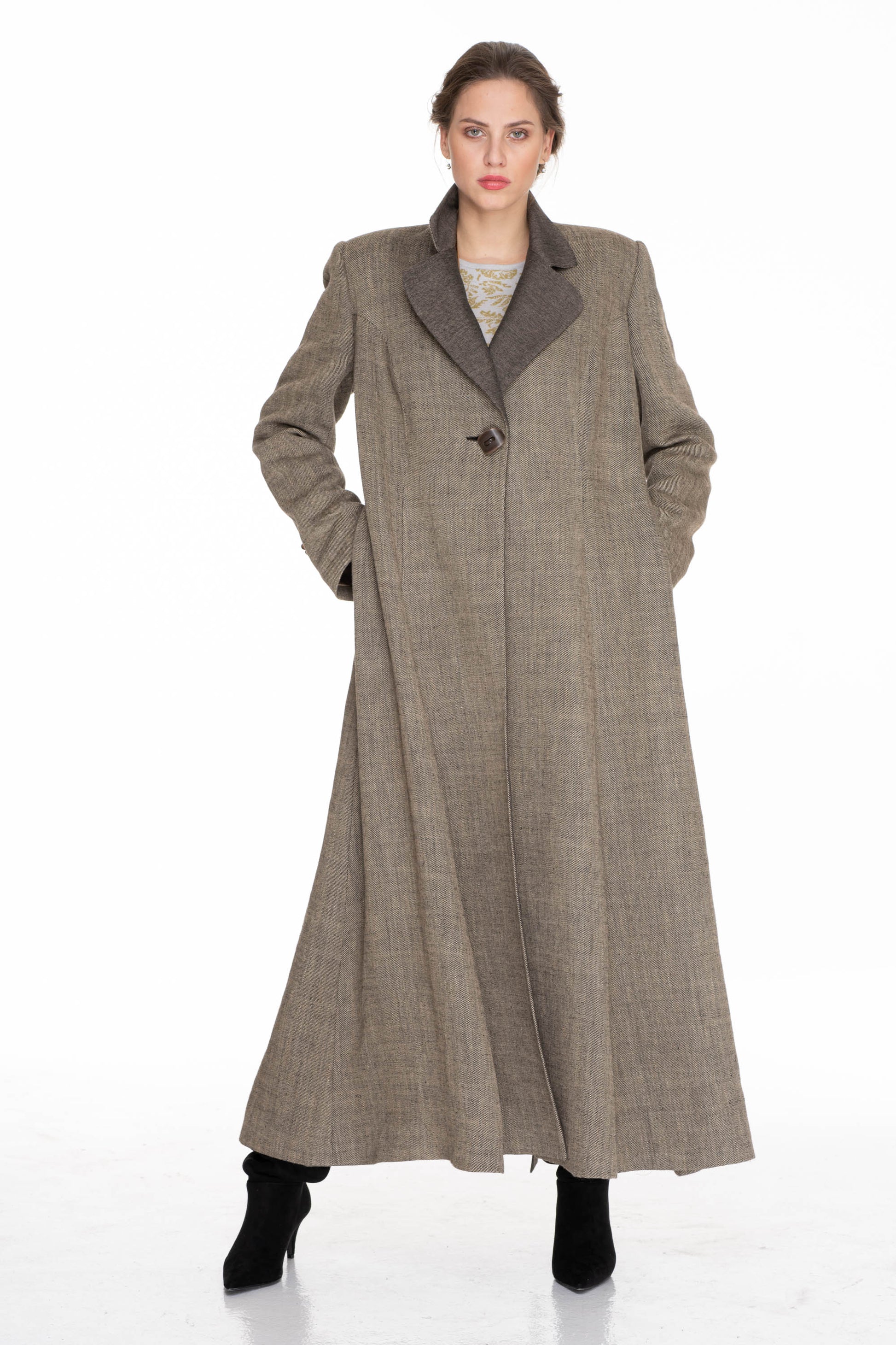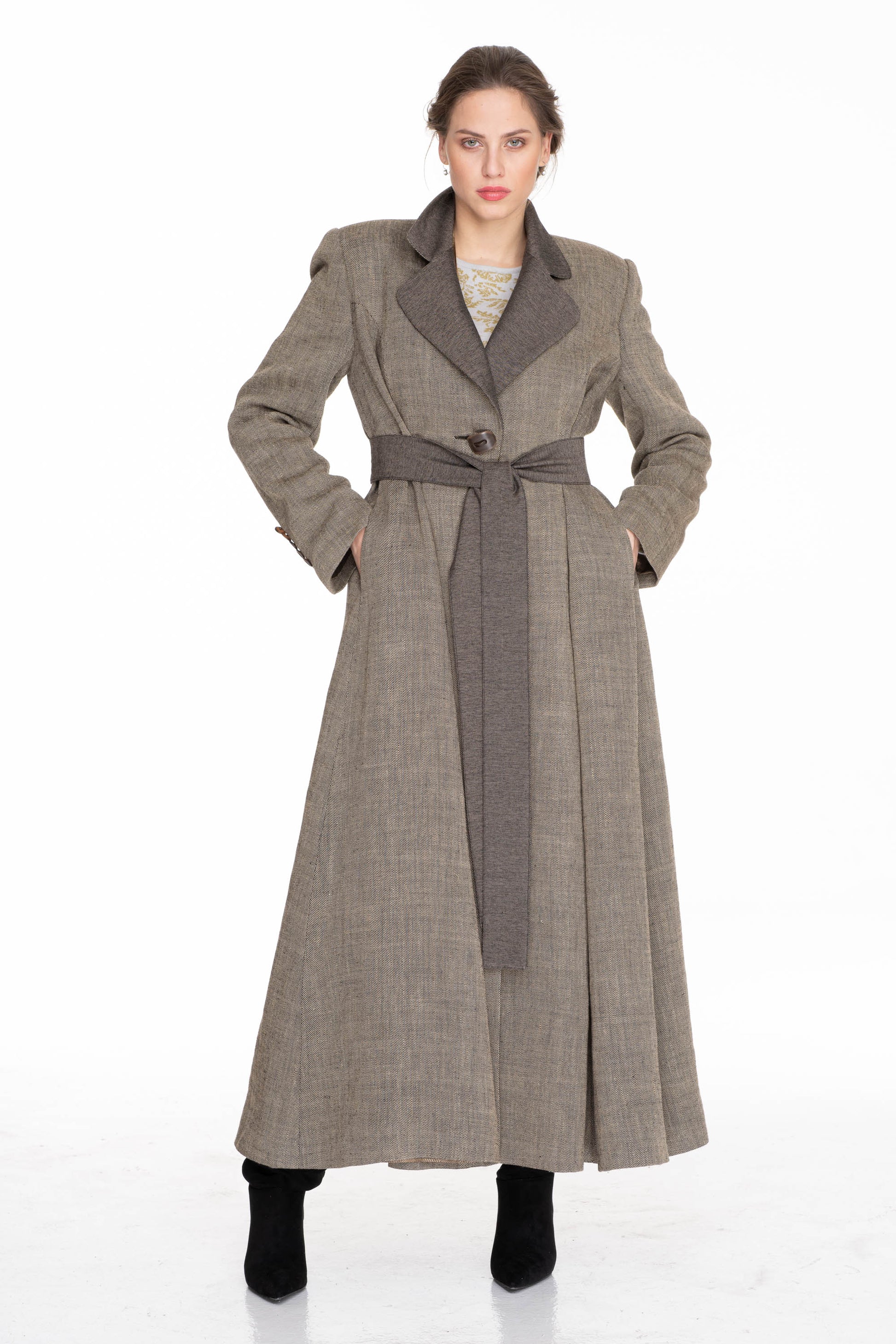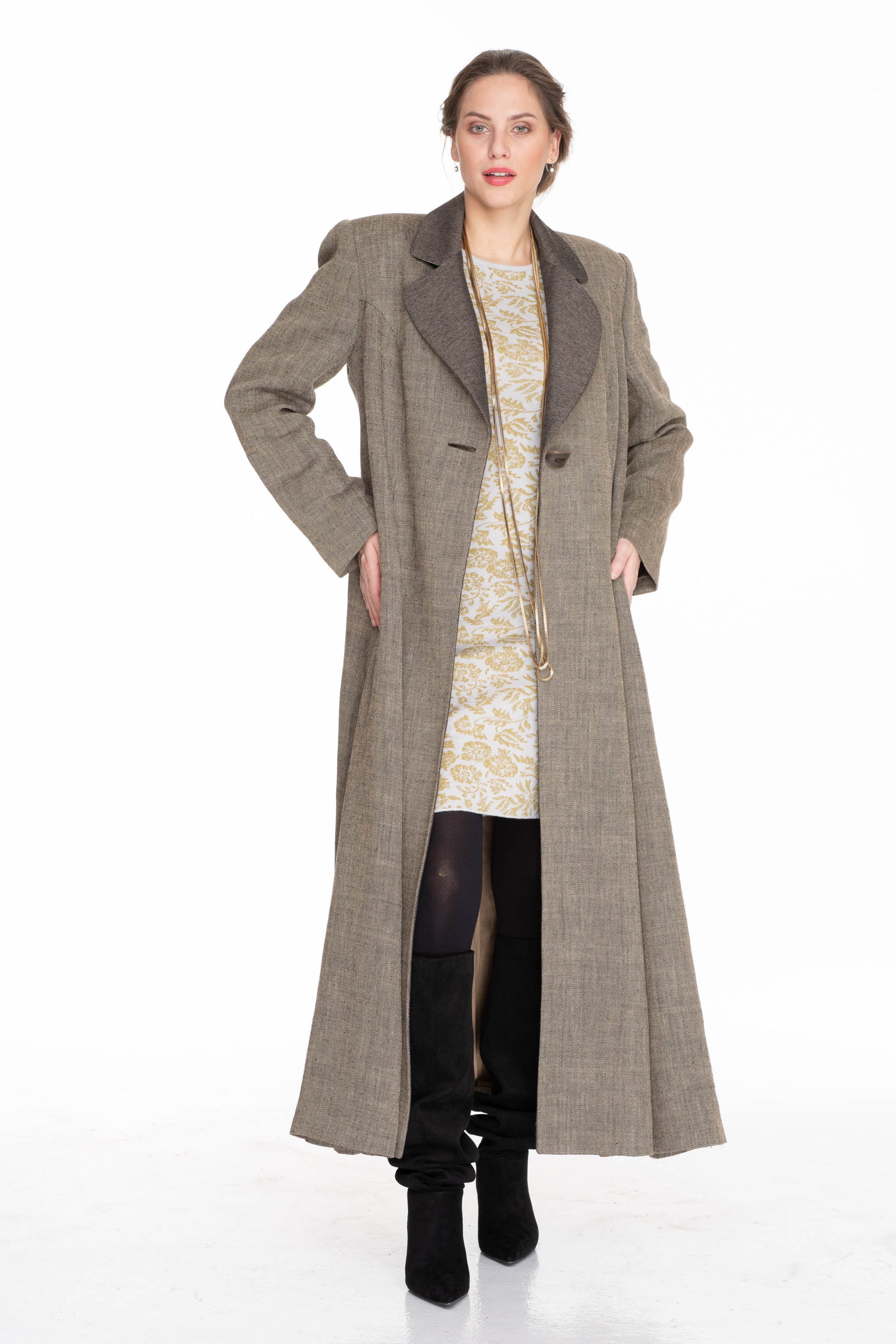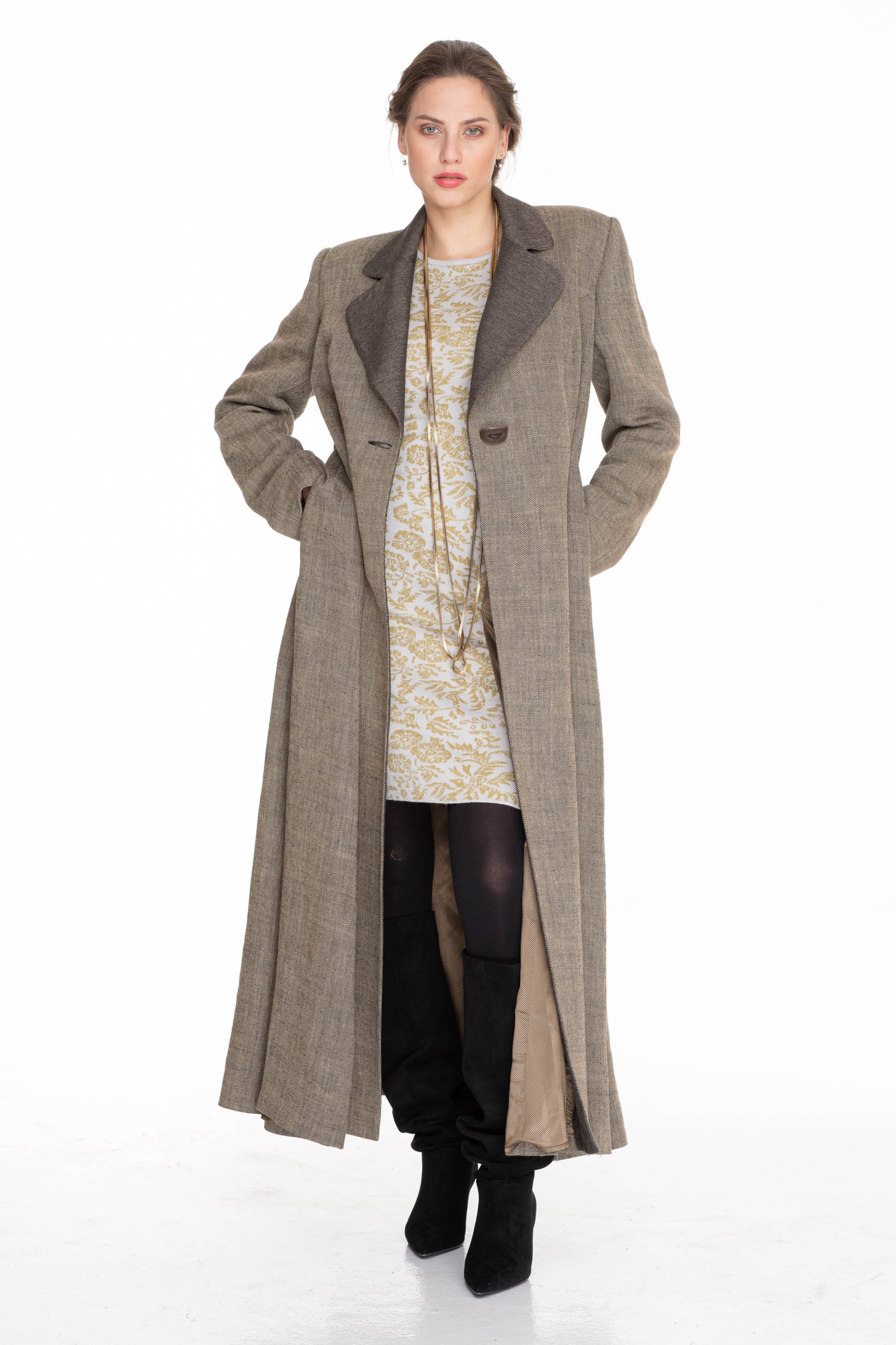 Dlouhý tvarovaný kabát s kontrastně barevně výraznými klopami