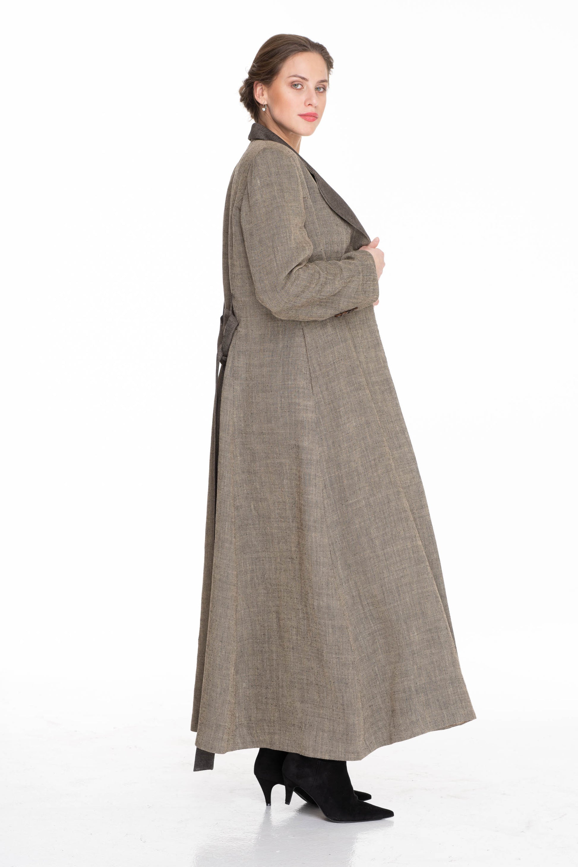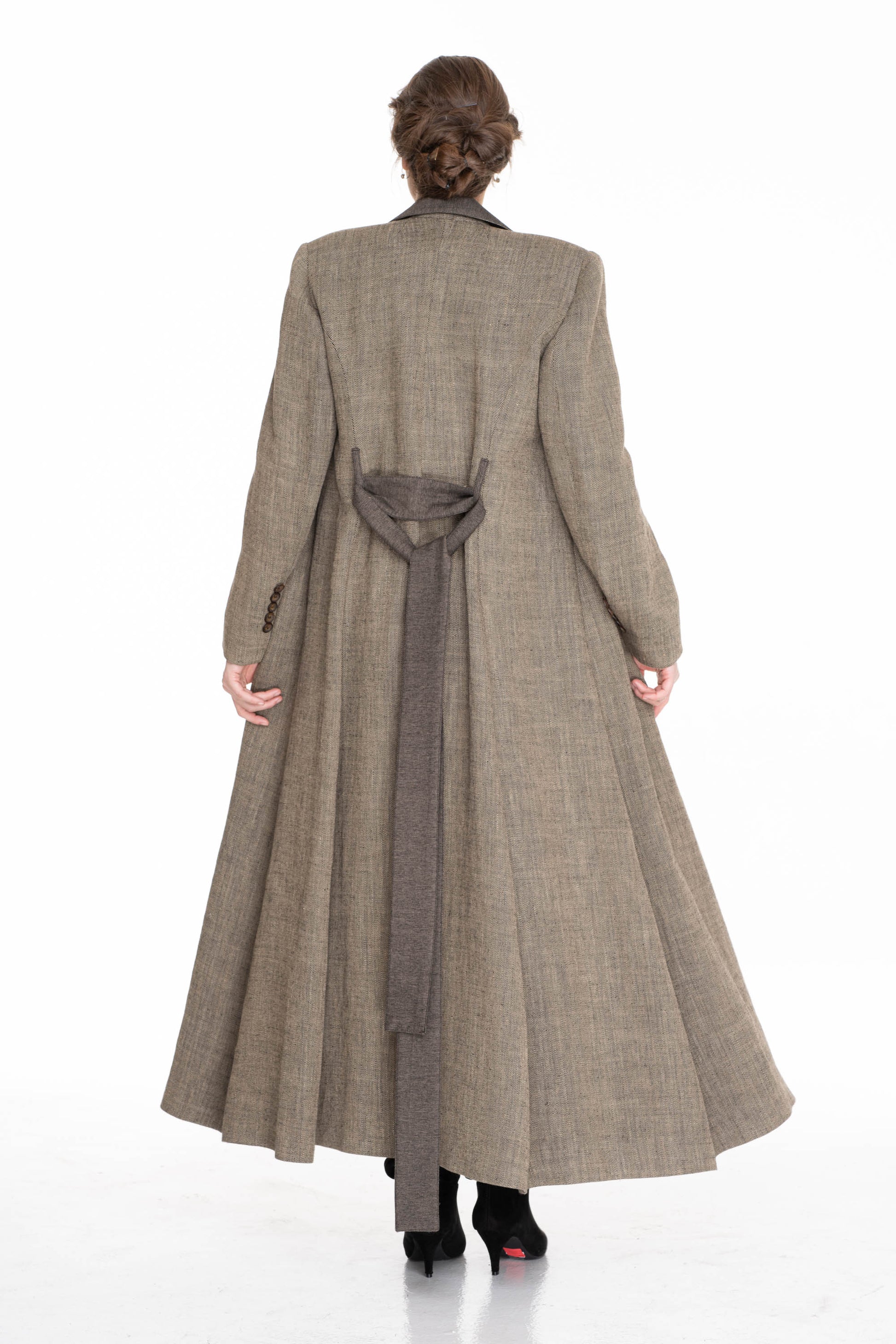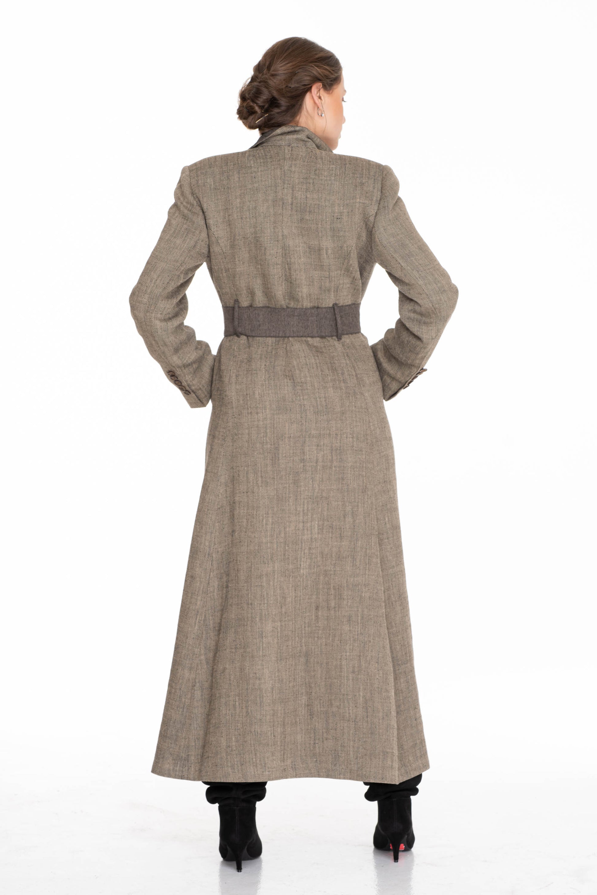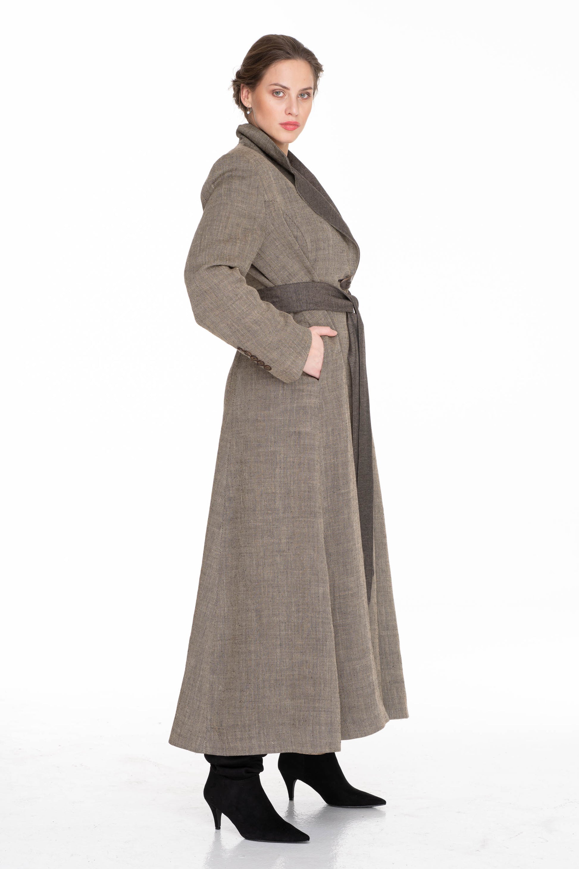 Dlouhý tvarovaný kabát s kontrastně barevně výraznými klopami