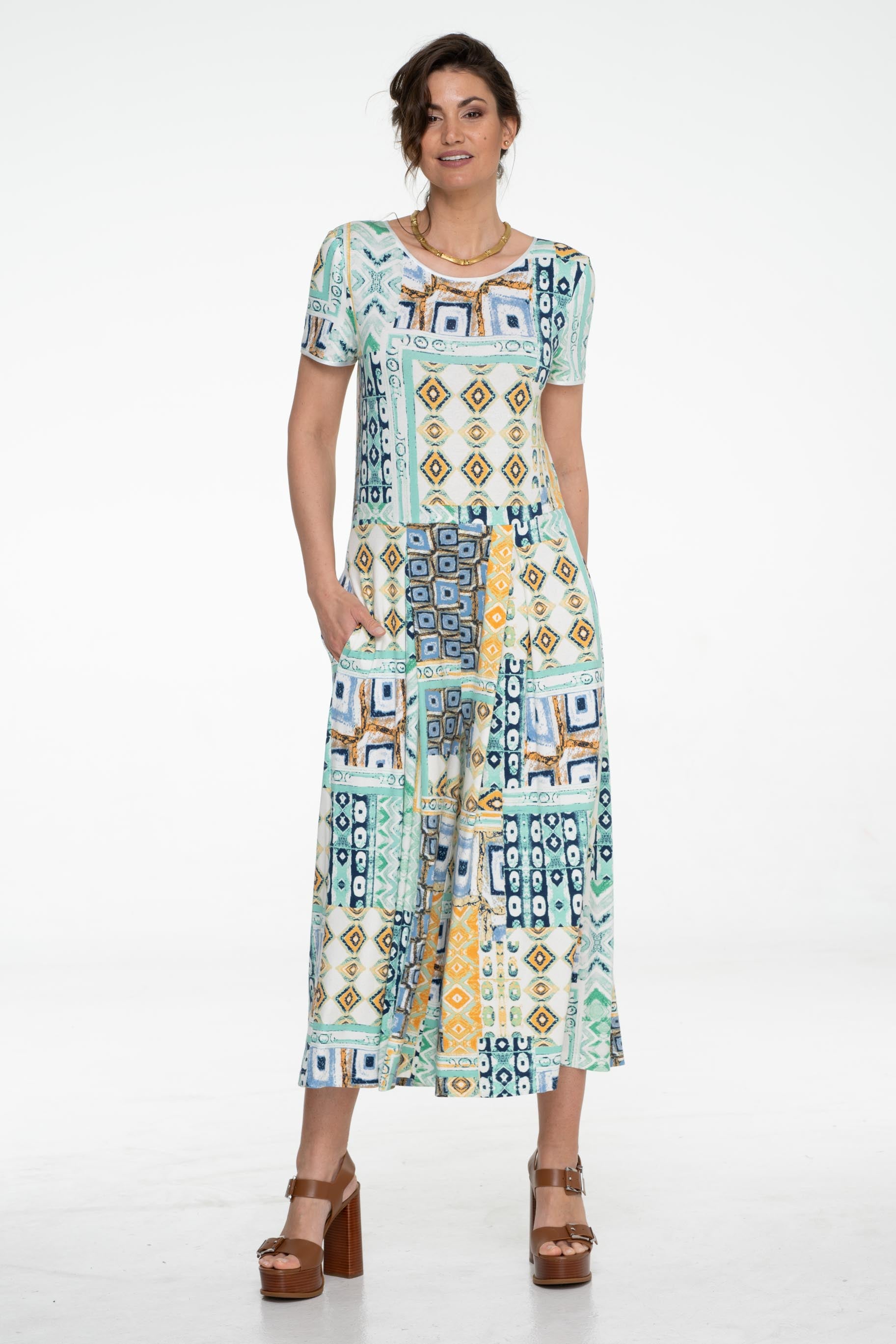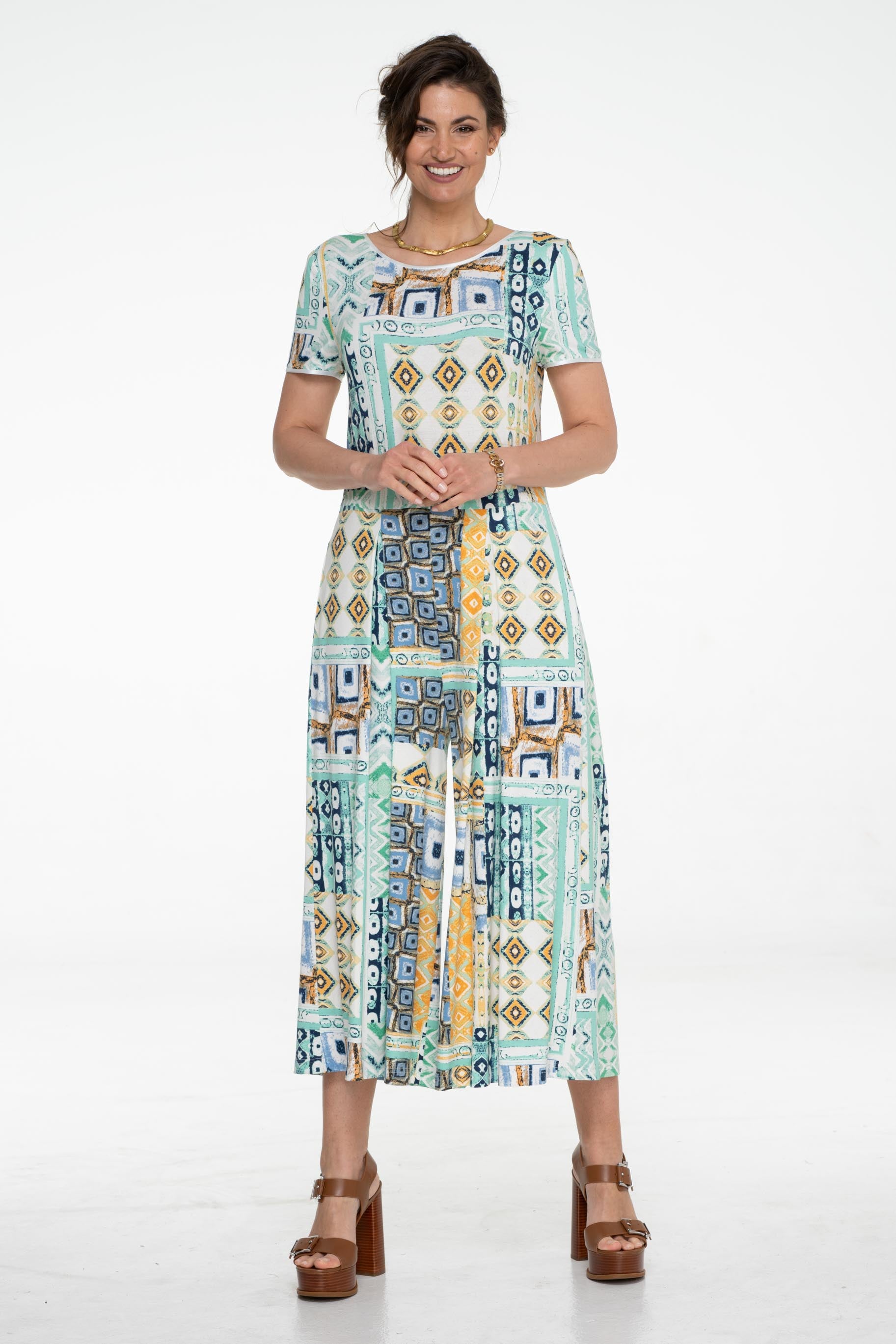 Splývavá kombinéza se širokými nohavicemi, krátké rukávy